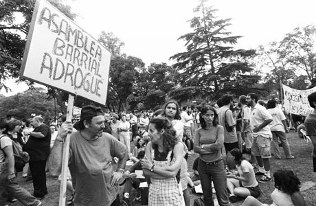 The new year began unlike any other in 2002, with new-found popular power, a sense of inter-class solidarity and innovative propositions for local decision making. From initial city-wide gatherings made up of thousands, assemblies began to be formed in local neighbourhoods. At first meeting in plazas and on street corners, they started to occupy buildings and organise themselves into work committees around press, culture, employment, services, health, political action and community purchases. The assemblies organised neighbourhood surveys to determine local needs. They set up soup kitchens, community gardens, tutoring programmes and radio stations, and continued the protests against the banks by staging direct actions and occupations.